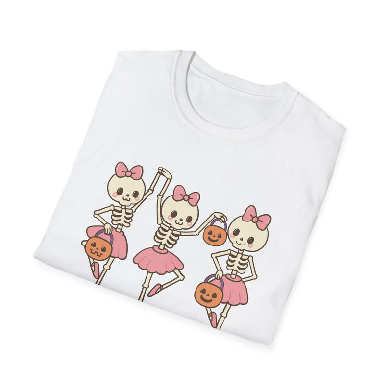 Get into the spooky spirit with this adorable tee featuring three pink-bowed skeletons ready to dance the night away! Dressed in tutus and holding pumpkin buckets, this playful design brings Halloween fun with a cute pastel twist. Soft, comfy, and perfect for any fall festivity or casual day out.