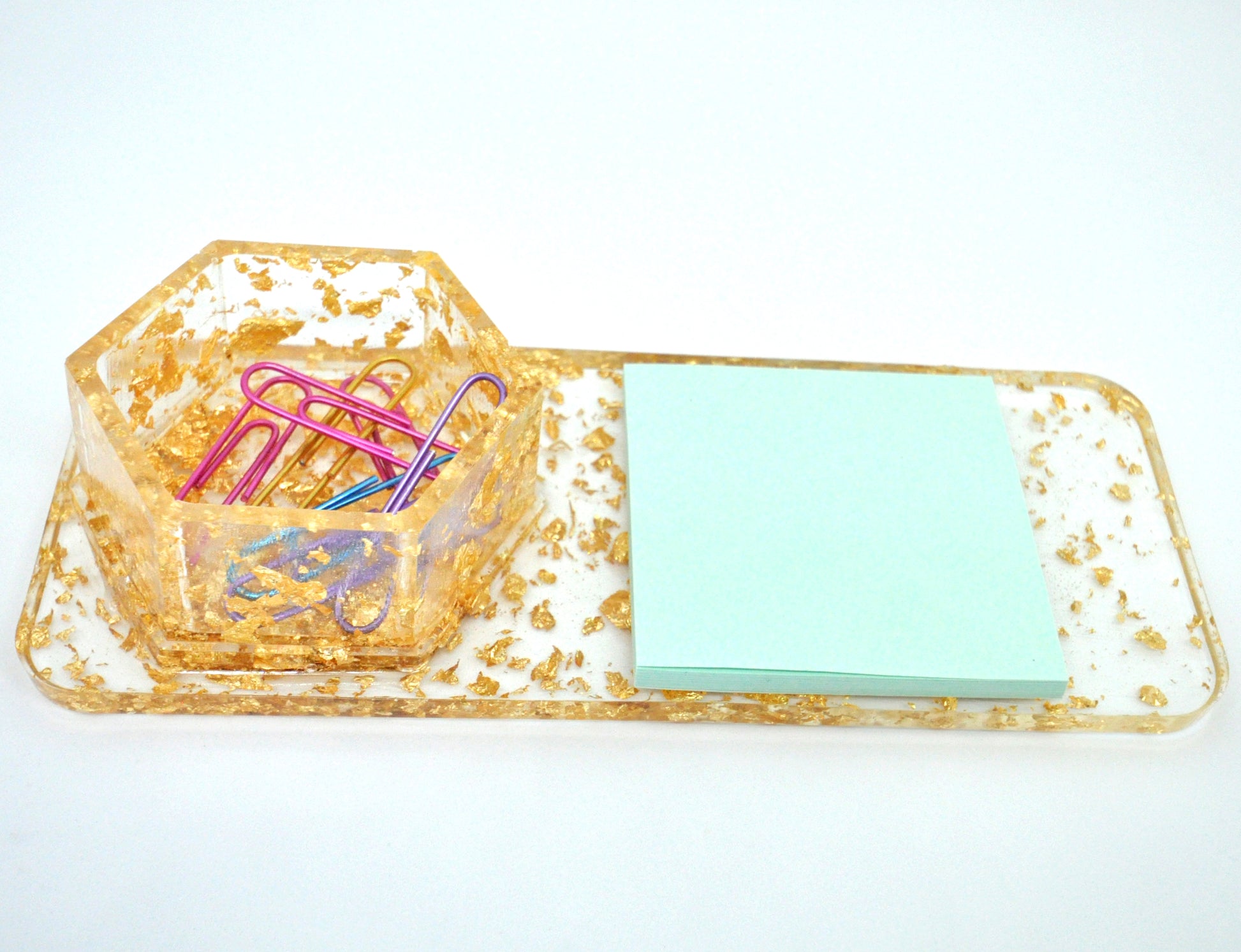 Elevate your desk with a touch of glam! ✨ This Gold Flake Resin Desk Tray Set features a sleek rectangular tray paired with a matching hexagon cup—perfect for holding sticky notes, paper clips, pins, and other tiny desk essentials.
