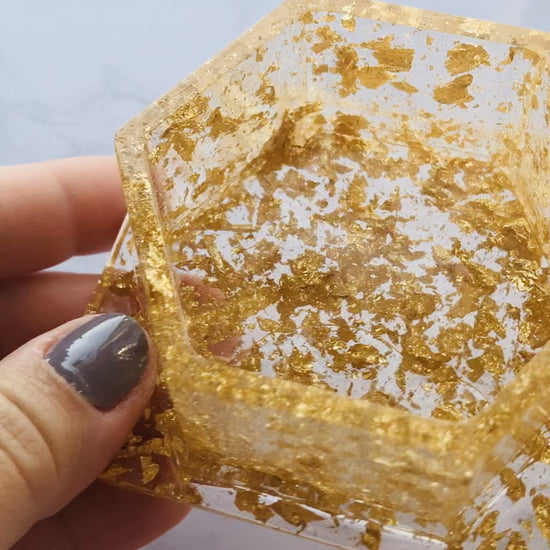 Hand-poured with clear resin and real gold foil flakes, this elegant duo sparkles with luxury while keeping your space beautifully organized.