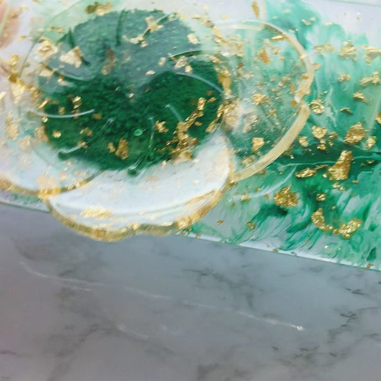 This one-of-a-kind piece features flowing green feather-like swirls accented with real gold foil flakes for a magical, nature-inspired look. The attached lotus dish is perfect for holding paper clips, rings, keys, or crystals—making this tray both functional and decorative.