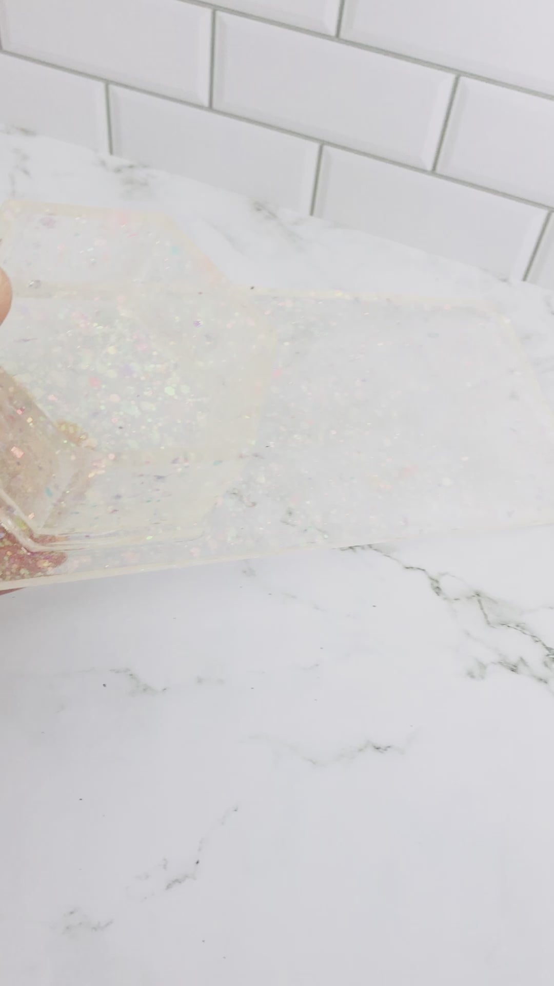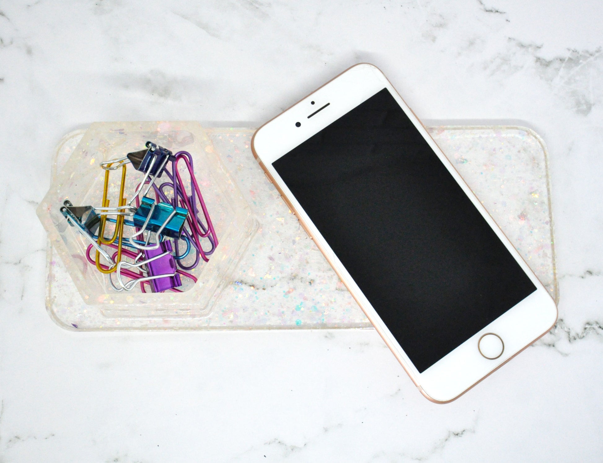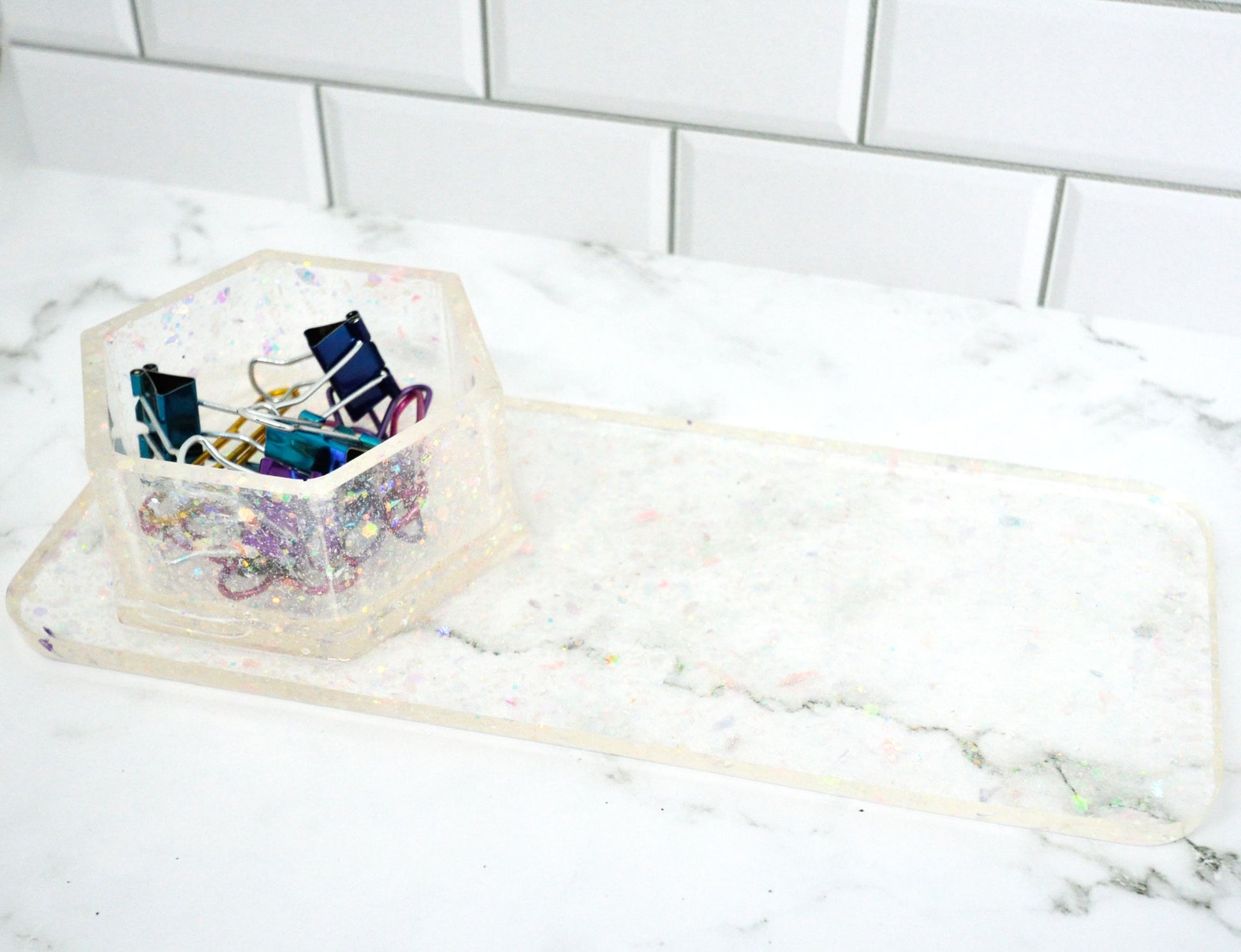 Bring some sparkle to your space with this dreamy Iridescent Resin Organizer Tray featuring a built-in hexagon-shaped cup! ✨🧊