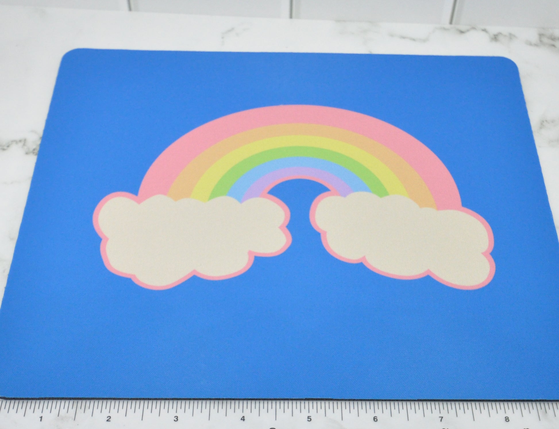 Featuring a pastel rainbow arching between two fluffy clouds on a bold blue background, this mouse pad is the perfect desk companion for students, creatives, or anyone who loves a pop of positivity. With a soft, smooth surface and non-slip rubber backing, it offers both comfort and control for everyday scrolling, clicking, or gaming.