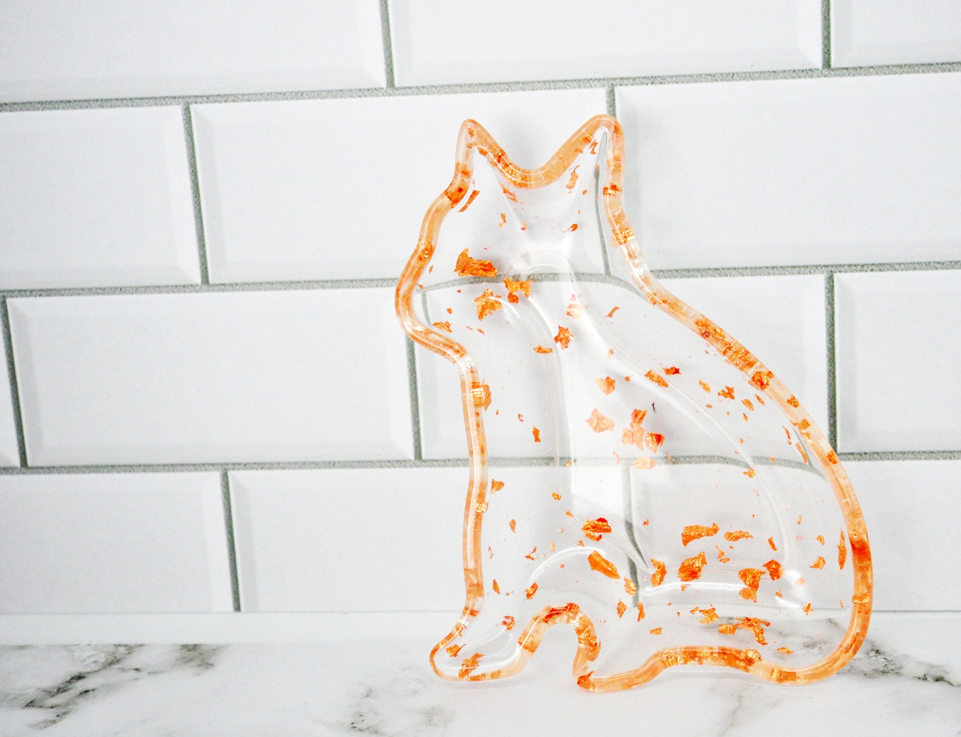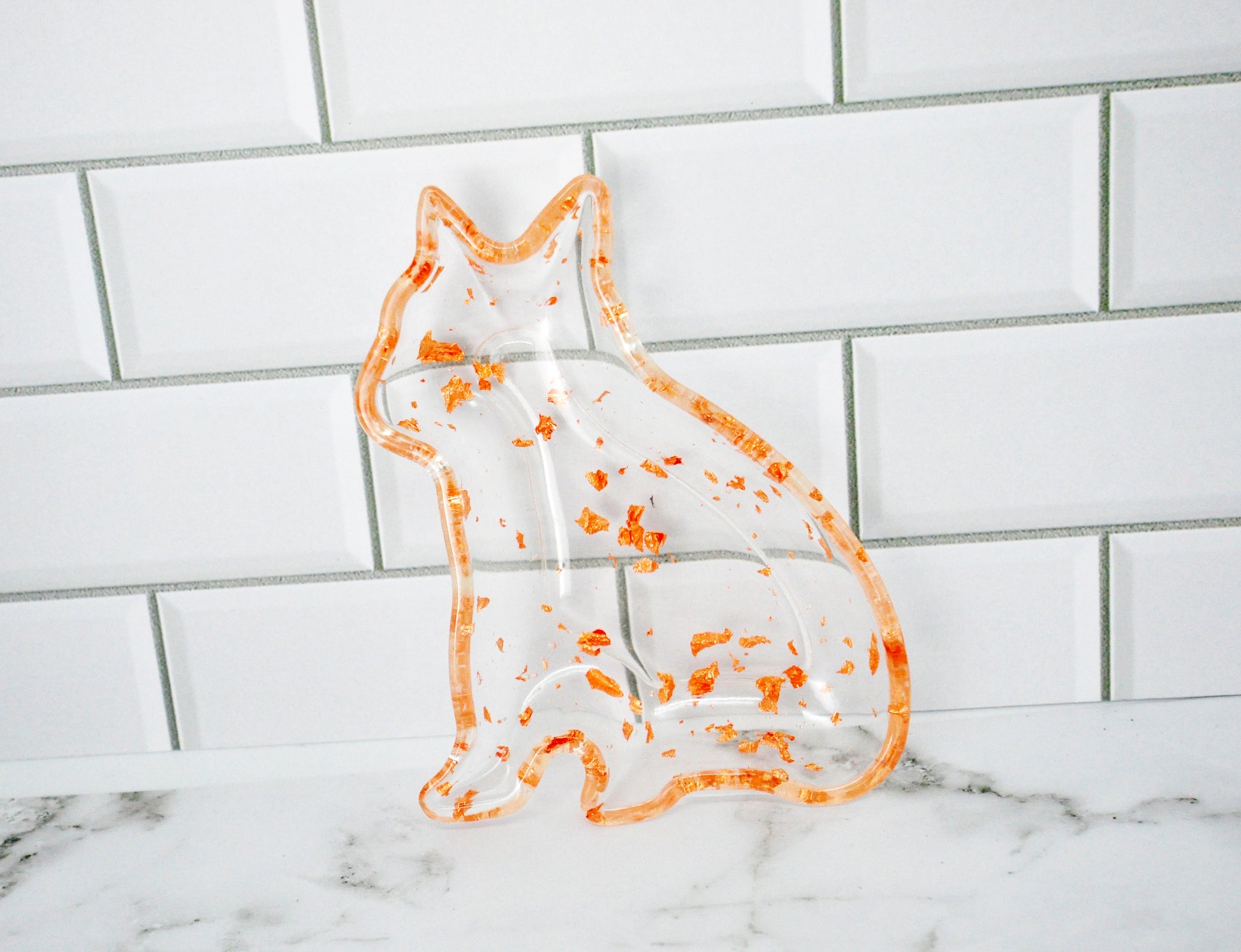 Add a touch of elegance and charm to your space with this handmade cat trinket dish. Made from clear resin with shimmering rose gold foil flakes, this piece is perfect for holding jewelry, keys, or tiny treasures. A stylish and one-of-a-kind accent for any cat lover’s vanity, dresser, or desk.